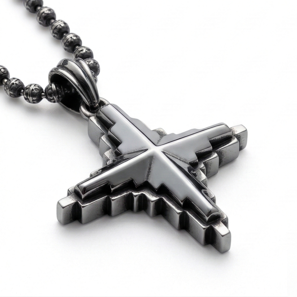 The centerpiece is hand-polished to a mirror finish, contrasting sharply against the darkened, textured recesses of the outer tiers. Paired with a rugged 3.5mm ball chain, it’s a statement piece designed for those who value architectural precision and dark, monochromatic luxury.