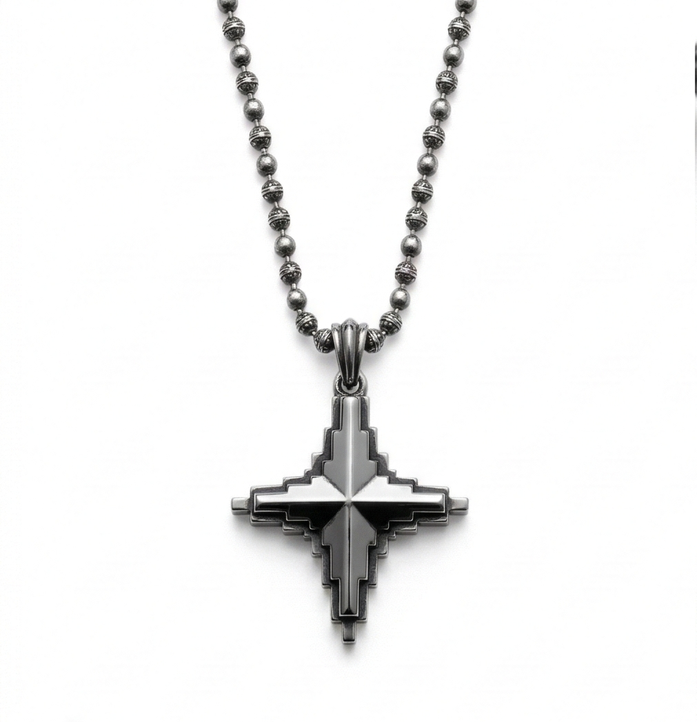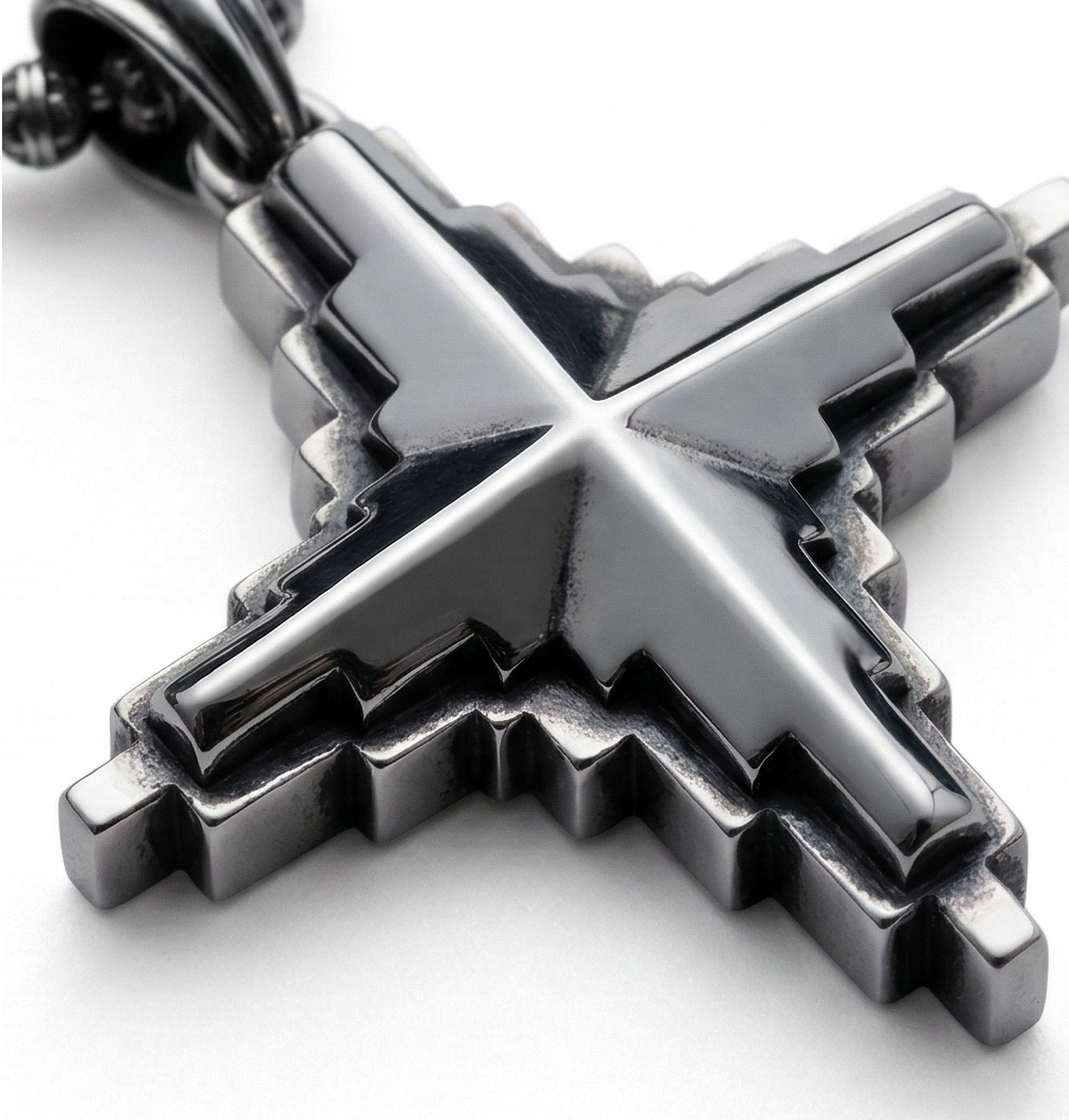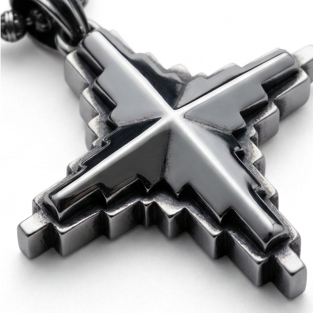Geometry meets Gothic. This pendant reimagines the classic celestial star through a brutalist, “glitched” lens. Crafted from high-grade sterling silver with a deep, oxidized patina, it features a unique multi-layered stepped design that creates a heavy, three-dimensional profile.